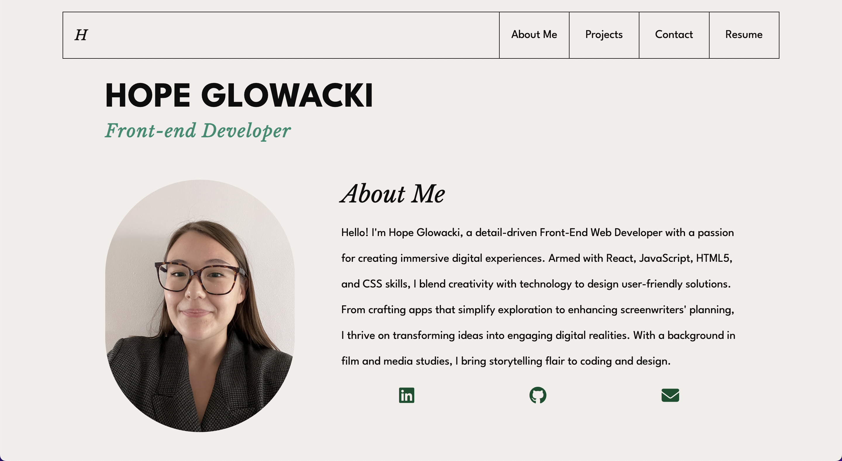 Hello! I'm Hope Glowacki, a detail-driven Front-End Web Developer with a passion for creating immersive digital experiences. Armed with React, JavaScript, HTML5, and CSS skills, I blend creativity with technology to design user-friendly solutions. From crafting apps that simplify exploration to enhancing screenwriters' planning, I thrive on transforming ideas into engaging digital realities. With a background in film and media studies, I bring storytelling flair to coding and design.